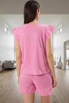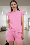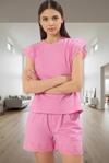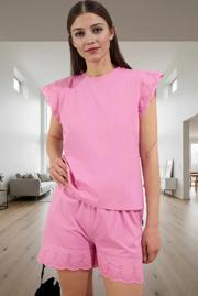 Pembe rengiyle şık bir görünüm sunan bu 2’li pijama takımı, yaz aylarının vazgeçilmez parçalarından biri olacak. Şortlu alt kısmı ile rahat hareket edebilir ve uyku kalitenizi artırabilirsiniz. Evinizde, tatilde veya hafta sonu keyiflerinizde rahatça kullanabilirsiniz. Bisiklet yakası ve büzgülü fırfırlı kolları, takıma feminen bir hava katar.