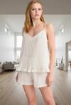 Bu pijama takımı, ince askılı, V yakalı ve fırfırlı detaylarıyla dikkat çeker. Regular kalıbı, çeşitli vücut tiplerine uyum sağlar. %100 pamuk materyalden üretilen bu pijama takımı, nefes alabilir, yumuşak ve hafiftir. Crinkle dokuma tipi ise hem şık bir görünüm hem de dayanıklılık sağlar. Boru paçalı şort tasarımıyla rahat ve tarz bir görünüm sunar.