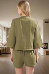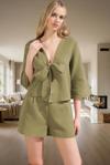 Bu muhteşem pijama takımının detaylarıyla kendinizi şımartın. Yumuşak ve nefes alan %100 pamuk müslin kumaşı, gün boyunca rahatlık sağlar. Şal yakası ve truva kol detaylarıyla modern bir görünüm sunarken, geniş paçalı şortları hareket özgürlüğünüzü kısıtlamaz. Normal beliyle rahat bir uyum sağlar ve her vücut tipine uyar.