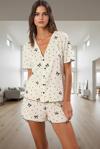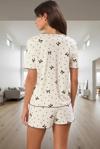 Yumuşak ve nefes alan %100 pamuklu kumaştan üretilen bu ekru pijama takımı, gün boyu rahatlık sunar. Kurdele fiyonk ve puantiye desenleriyle şık bir görünüme sahip olan takım, asimetrik yakası ve baby overlok detaylarıyla kaliteyi ön plana çıkarır. Şortlu tasarımıyla yaz aylarında serin ve konforlu kalmanıza yardımcı olur. Regular kalıbıyla vücuda tam oturan takım, rahat bir uyku ve dinlendirici bir ev deneyimi için idealdir. 30/1 openend süprem dokuma tipiyle uzun ömürlü kullanım sağlar. Lounge ve home ortamlarında rahatlıkla tercih edebilirsiniz. Makinede yıkanabilir özelliğiyle pratik kullanım sunar. Bu 2'li takım; tişört ve şorttan oluşur. Yaz mevsimine özel tasarımıyla evde dinlenirken şık ve rahat hissetmenizi sağlar.