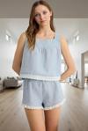 Rahatlığı ve şıklığı bir arada arayan kadınlar için ideal bir seçim olan bu pijama takımı, yumuşak pamuklu kumaşıyla gün boyu konfor sunuyor. Mavi rengin sakinleştirici etkisiyle uykunuza huzur katacak, ince detaylarla zenginleştirilmiş tasarımıyla da kendinizi özel hissetmenizi sağlayacak. Atlet ve şorttan oluşan takımın, atlet kısmı kalın askılı ve kare yakalı olup, şortun paçaları ise boru paça şeklindedir. İpliği boyanmış poplin kumaştan üretilen bu pijama takımı, nefes alabilir yapısı ile yaz aylarında serin kalmanıza yardımcı olur. Eşsiz dantelli detaylarıyla tarzınıza ince bir dokunuş katarak, keyifli ve rahat bir uyku deneyimi yaşamanızı sağlar. Makinede 60 derecede yıkayabilirsiniz. Bu takımla evinizde huzurlu ve şık vakit geçirebilirsiniz.