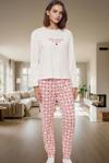 Yüksek kaliteli pamuktan üretilen bu pijama takımı, nefes alabilir ve hassas cilde uygundur. Regular kalıbı, vücut hatlarınıza mükemmel uyum sağlar. Mix baskı tekniği ile elde edilen kalpli ekoseli desen, pijama takımına özel ve şık bir hava katar. Boru paça alt ile modern bir görünüm elde edilirken, uzun kolları sayesinde soğuk kış gecelerinde de sıcak kalırsınız. Gün boyu süren konforu ile kendinizi özel hissedeceksiniz.
