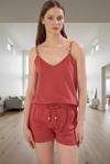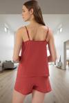 %100 pamuk kumaşın yumuşaklığı ve nefes alabilirliği, cildinizde gün boyu ferahlık hissi bırakır. Pike dokuma yapısı, dayanıklı ve uzun ömürlü kullanım sunar. Regular kalıp, her vücut tipine mükemmel bir uyum sağlar. Boncuk detaylı ince askılı üst ve boru paçalı şort, hem şık hem de rahat bir görünüm oluşturur. Evde rahatlayabileceğiniz, misafirlerinizi ağırlayabileceğiniz veya yatakta huzurlu bir uyku çekebileceğiniz çok yönlü bir seçenektir.