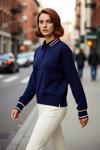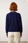 Ürün Özellikleri: Oversize kalıp, %100 akrilik materyal, renk bloklu desen, polo yaka, düşük kol, triko kumaş, lacivert renk, orta kalınlık.