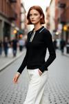 Bu kadın triko kazak, fitted kalıbı ile vücuda zarifçe oturarak modern ve şık bir siluet oluşturur. Yüksek kaliteli viskoz, polyester ve poliamid karışımı özel materyali sayesinde gün boyu süren konfor ve yumuşak bir dokunuş sunar. Canlı renk bloklu deseni, özellikle yaka ve manşetlerdeki kontrast beyaz detaylarla ürüne dinamik bir hava katarken, zamansız siyah rengi her türlü kombinasyona kolayca uyum sağlar. Merserize görünümlü ince iplik dokusu, şıklığı ve rahatlığı bir araya getirerek günlük tarzınıza sofistike ve elegant bir dokunuş ekler, sizi her ortamda ön plana çıkarır.