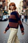 Ersefa Kadın Rahat Kalıp Düşük Kol Bisiklet Yaka Renk Bloklu Akrilik Triko Kazak Günlük Kullanım Şıklığı.