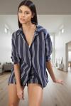 Viskoz ve poliamid karışımı crinkle dokuma kumaş, nefes alabilirlik ve yumuşaklık sunar. Çizgili desen, modern ve şık bir görünüm sağlar. Regular kalıp ve standart kol boyu sayesinde her vücut tipine rahatça uyar. Boru paça şortlar modern bir görünüm katar. İpliği boyanmış kumaş, renklerin uzun süre canlı kalmasını sağlar. Evde, lounge alanında veya yatak odasında rahatlıkla kullanabilirsiniz.