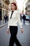 Fular yaka tasarımı, boyun bölgesine hoş bir açıklık katarken, eşlik eden kadife fiyonk detayı ile kişisel stilinizi yansıtma imkanı sunar. Uzun standart kolları, soğuk havalarda ekstra koruma sağlarken, hareket özgürlüğünüzü kısıtlamaz. Tek plaka dokuma triko kumaşı, nefes alabilen yapısıyla gün boyu rahatlık sunar ve orta kalınlıktaki yapısıyla ideal bir sıcaklık dengesi sağlar. Ajurlu deseni, kazağa hava katarken, üzerine özenle işlenmiş inciler ışıltılı bir dokunuş ekler. Cepsiz ve kemersiz basic silueti, sade ve zarif bir duruş sergiler. Kaliteli materyal bileşimi sayesinde uzun ömürlü kullanım sunar ve T41 yıkama talimatı sayesinde makinede kolayca temizlenebilir, pratik bir kullanım deneyimi sunar.