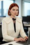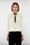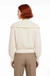 Ürün Özellikleri: Regular kalıp, polyester karışımlı materyal, ajurlu desen, fular yaka, standart kol, triko kumaş, bej renk, inci detaylı, cepsiz.