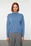 Bu şık Kadın Regular Kalıp Düğme Detaylı Triko Kazak, kış mevsiminde gardırobunuzun vazgeçilmezi olmaya aday. Regular kalıbı sayesinde her vücut tipine uyum sağlayan rahat ve şık bir duruş sunar. Yüksek kaliteli polyester ve viskoz karışımı materyali, soğuk havalarda sizi sıcak tutarken aynı zamanda yumuşak bir dokunuş hissi verir. Düz deseni ve baskısız tasarımıyla sade bir zarafet sunarken, omuzlarındaki düğme detayları kazağa modern ve özgün bir hava katıyor. Mavi rengi, farklı kombinlerle kolayca uyum sağlayarak günlük şıklığınızı tamamlar.