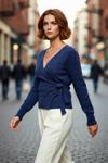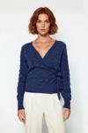 Ürün Özellikleri: Regular kalıp, 79% akrilik 21% polyester materyal, ajurlu desen, kruvaze yaka, standart kol, triko kumaş, mavi renk.