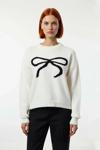 Şık ve konforlu bir deneyim sunan bu kadın triko kazak, regular kalıbıyla bedene rahatça oturur ve gün boyu esneklik sağlar. Yumuşak dokulu %100 akrilik materyali, kış soğuklarına karşı etkili bir koruma sağlarken, aynı zamanda cildinize hassas bir temas sunar. Ekru rengin asil duruşu, önündeki zarif fiyonk deseniyle hareketlenerek modern ve çekici bir stil yaratır. Bu baskılı tasarım, kazak üzerindeki basic silueti tamamlayarak her ortamda dikkat çekmenizi garantiler.