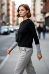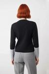 Ürün Özellikleri: Regular kalıp, akrilik materyal, renk bloklu desen, bisiklet yaka, standart kol, triko kumaş, siyah renk, baskısız tasarım.