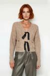 PayBuy Kadın Regular Kalıp V Yaka Saç Örgü Desenli Düşük Kol Crop Triko Kazak Kurdele Fiyonk Detaylı