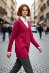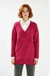 Ürün Özellikleri: Relaxed kalıp, akrilik polyester materyal, düz desen, V yaka, düşük uzun kol, triko kumaş, pembe renk.