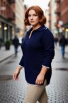Ürün Özellikleri: Relaxed kalıp, akrilik materyal, düz desen, dik yaka, düşük kol, triko kumaş, lacivert renk, baskısız tasarım.