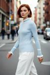 Bu kadın triko kazak, fitted kalıbı ile vücuda zarifçe oturarak modern bir siluet sunar. Yüksek kaliteli %100 akrilik materyali sayesinde kış aylarının soğuk günlerinde üstün sıcaklık ve konfor sağlarken, aynı zamanda cilde yumuşak bir dokunuş hissi verir. Mavi rengi, renk bloklu tasarımıyla (yaka ve kol detaylarındaki beyaz şeritler) dinamik bir hava katarak gardırobunuza canlılık getirir. Fitilli dokuma tipi, kazaka kendine özgü bir doku ve estetik derinlik kazandırır, sade ve basic silueti ise her tarza kolayca uyum sağlar. Cepsiz tasarımı temiz ve minimalist bir görünüm sunar.