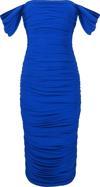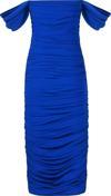 Zarif saks mavisi tonuyla dikkat çeken bu midi elbise, düşük kol tasarımı ile modern ve şık bir görünüm sunar.