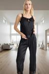 Saten kumaşın yumuşaklığı ve dantel detayların şıklığıyla buluşan bu siyah pijama takımı, evinizdeki rahatlığınızı bir üst seviyeye taşıyacak. İster keyifli bir film gecesi ister huzurlu bir uyku için ideal olan bu takım, gün boyu süren konforu garanti eder. Kaliteli saten dokuma, cildinize nazikçe dokunurken, zarif dantel detaylar ise takımınıza feminen bir hava katar. Normal bel yapısı ve regular kalıbı sayesinde vücudunuza mükemmel uyum sağlar. Kolay bakım için makinede 60 derecede yıkanabilir. İki parçalı takım, üstünde ince askılar ve V yaka detayı ile göze hitap ederken, alt parçası ise boru paça tasarımıyla şıklığıyla rahatlığı birleştirir. Bu takımla evde vakit geçirmenin keyfini çıkarın. Rahat bir uyku veya dinlendirici bir ev günü için mükemmel bir tercihtir. Şık ve rahat tasarımıyla, evinizdeki stilinizi yansıtır.
