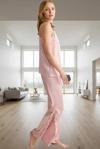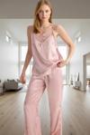 Saten dokusuyla teninize değen yumuşaklığı ve şıklığı hissedeceğiniz bu pembe pijama takımı, evde geçireceğiniz zamanları daha konforlu hale getirecek. İnce askılı, V yaka üstü ve rahat kalıbıyla gün boyu rahat hareket etmenizi sağlar. Dantel detayları ise takımın şıklığını tamamlar. İlkbahar ve sonbahar aylarında idealdir. Hem şık hem de rahat, bu pijama takımıyla kendinizi evinizin rahatlığında şımartın. Pamuk içermeyen %100 polyester kumaştan üretilen bu takım, kolay bakımıyla da dikkat çekiyor. Makinede 60 derecede yıkanabilir. Normal bel ve regular kalıbıyla birçok vücut tipine uyum sağlar. Bu takımda, rahatlığı ve şıklığı bir arada yaşayın. Paket içeriğinde atlet ve pantolon olmak üzere 2 parça bulunur.