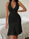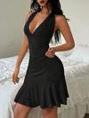Kadın Sıfır Kol Derin V Yakalı Bağcıklı Sırt Dekolteli Etek Fırfır Detaylı Sandy Elbise