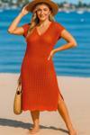 Kadın Sıfır Kol V Yaka Yanı Derin Yırtmaçlı Midi Boy Triko Elbise