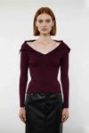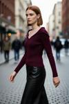 Ürün Özellikleri: Fitted kalıp, polyester materyal, düz desen, devrik yaka, standart kol, triko kumaş, bordo renk.