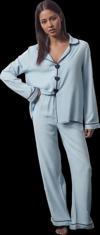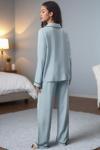 Bu şık ve modern pijama takımı, hem uyku konforunuzu artırır hem de ev içinde kendinizi zarif hissetmenizi sağlar. Hafif dökümlü kumaşı, tene yumuşak bir dokunuş sunarken, kalp formundaki düğmeleriyle detaylara önem veren kadınların tercihi oluyor. Ruhu dinlendiren açık mavi tonu, sade ama etkileyici bir estetik sunar.