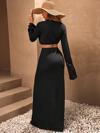 ModaSehle Kadın Siyah Bürümcük Kumaş Maxi Boy Yırtmaçlı Halka Detaylı Elbise