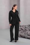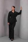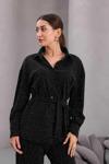 Kadın Siyah Fiyonklu Oversize Gömlek ve Bağcıklı Beli Lastikli Taş İşlemeli İkili Takım, modern kadınların şıklığını ve rahatlığını bir araya getiriyor. CEMO markasının zarif tasarımı, oversize kesimi ile günlük kullanımda konfor sunarken, fiyonklu detaylarıyla da şıklığı ön plana çıkarıyor.