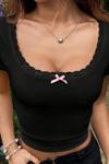 Kadın Siyah Göğsü Ve Kolları Dantelli Fiyonklu Kısa Kol Crop Top Bluz