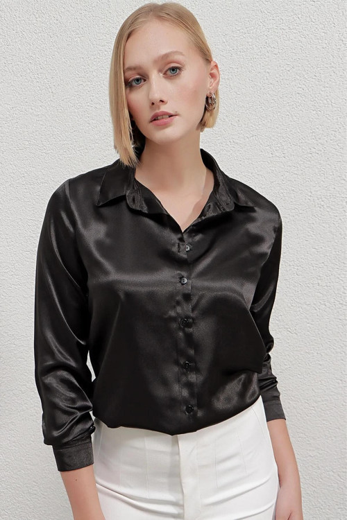 Kadın Siyah  Hafif Dökümlü Saten Yüzeyli Gömlek HZL22W-BD139641