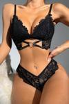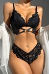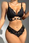 Kadın Siyah Kalp Tokalı Çapraz Lastik Detaylı Dantel İç Çamaşır Takımı