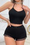 Beruflic Kadın Siyah Kaşkorse Sırt Ve Bacak Kısmı Puantiyeli Şortlu Gecelik Takım