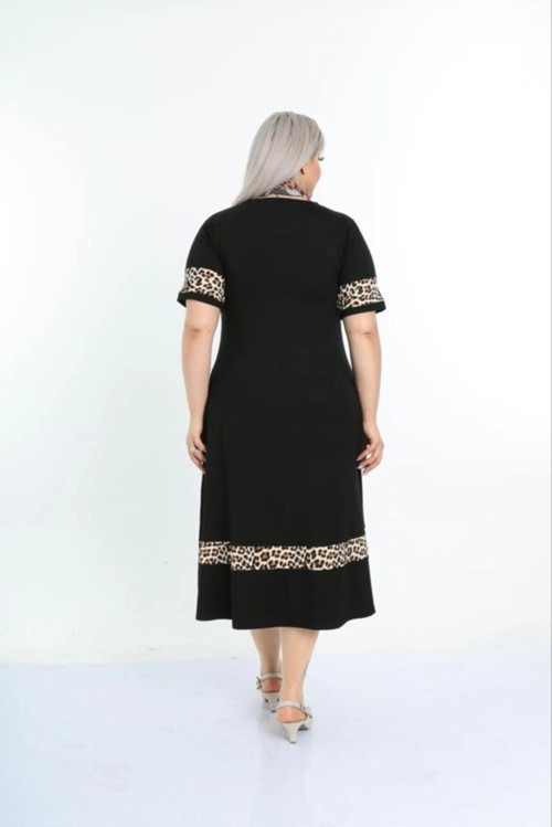 Kadın Siyah Kol ve Etek Ucu Leopar Desenli Büyük Beden Elbise