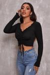 Kadın Siyah Uzun Kollu Büzdürme Bağcık Detaylı Crop Top Bluz