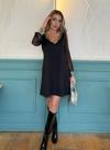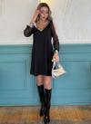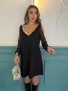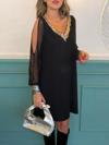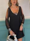 Kadın Siyah Uzun Kollu Kollar Tül Yırtmaçlı V Yakalı Kısa Krep Elbise