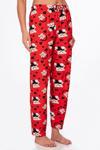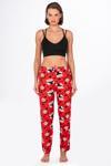 Kadın Süet Kalpli Ayıcık Desenli Pijama Tek Alt, canlı kırmızı zemini ve siyah kalp detaylarıyla enerjik bir görünüm sunar.