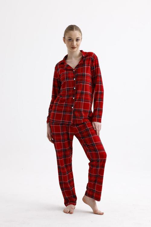 Kadın Süet Önden Düğmeli Pijama Takımı | Ekose Kırmızı