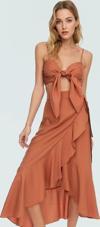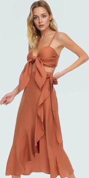 Bu takım, 2 parçadan oluşur; bağlamalı bluz ve volanlı etek. Yüksek bel etek, vücudunuzu sararak zarif bir siluet oluşturur. Bluzun bağlamalı detayı, görünümünüze kişisel bir dokunuş katmanıza olanak tanır. Günlük kullanım için şık bir sandalet veya plaj için terliklerle kombinleyebilirsiniz. Şıklığı ve rahatlığı bir arada arayan kadınlar için ideal bir seçimdir.