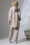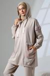 Kapüşonlu ve fermuarlı üstü, ithal dokuma kumaş garni detaylarıyla şıklığınızı öne çıkarır.