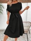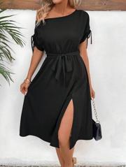 Kadın Tek Omuzu Açık Kol Ucu Fiyonklu Belden Kuşaklı Yırtmaç Detaylı Viskon Elbise