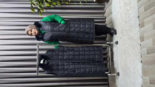 Büyük beden tesettür dış giyim modellerimiz arasında yer alan bu kapüşonlu, fermuarlı, kürklü piramit desen şişme kapitone yelek, soğuk havalarda hem sıcak tutar hem de modern görünümüyle tarzınızı tamamlar.