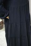 Kat kat volanlı tasarımı sayesinde elbiseye zarif bir hareket kazandıran bu model, büyük beden tesettür elbise koleksiyonlarının en şık parçalarından biridir. Katlı kesimi, hem boyu uzun gösterir hem de vücut hatlarını belli etmeden akıcı bir görünüm sunar.
