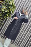 Hafsa Mina Kapüşonlu Çizgili Uzun Trençkot Siyah HM2332