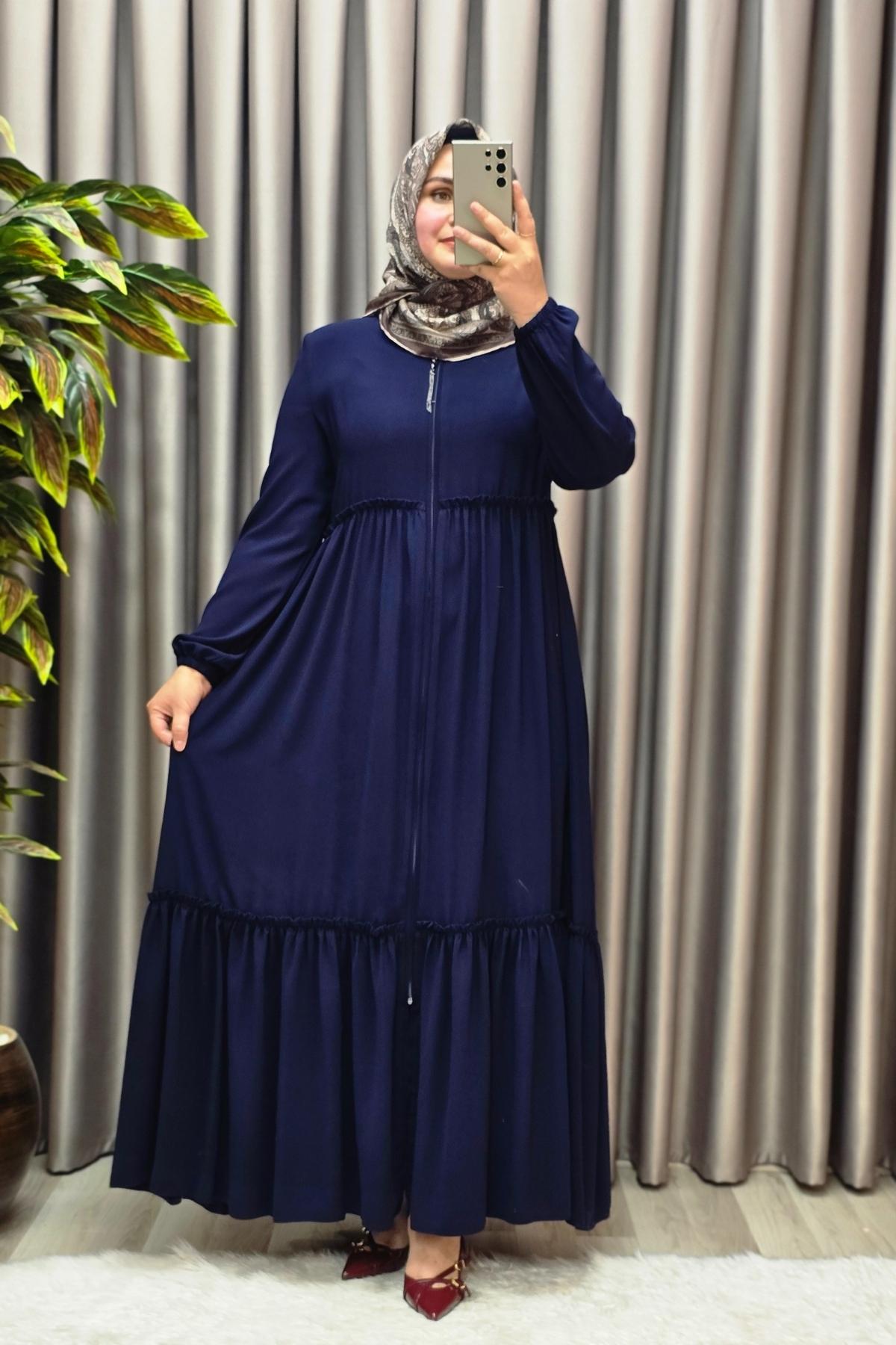 Endonezya krep kumaştan üretilen bu modern tesettür ferace, büyük beden (40-60) aralığına uyum sağlayan rahat kalıbıyla hem şıklığı hem de konforu bir arada sunar.