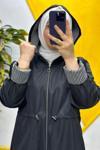 Hafsa Mina Kapüşonlu Çizgili Uzun Trençkot Siyah HM2332