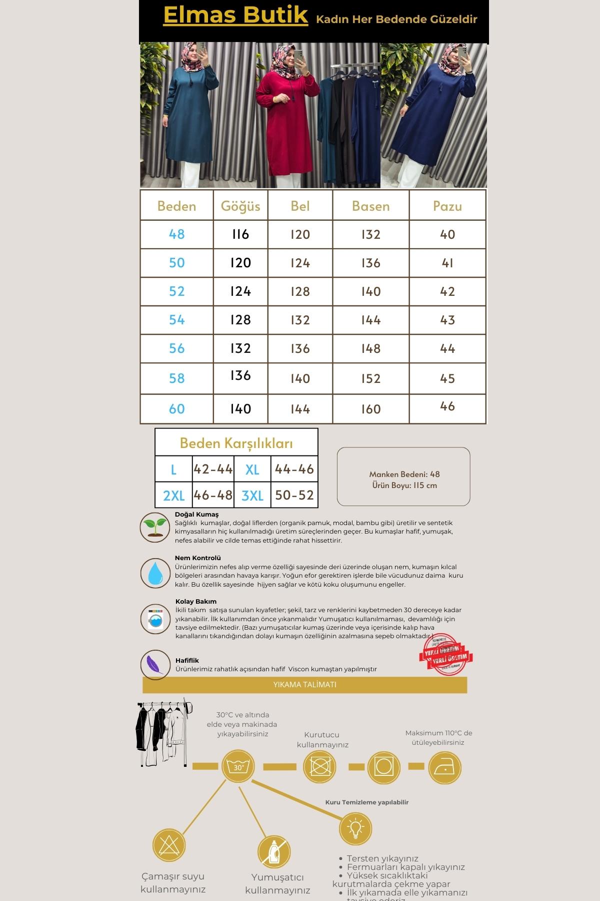 Hem klasik hem de spor kombinlere kolayca uyum sağlayan bu model, günlük tesettür tunik, ofis tuniği veya şık akşam kombinleri için ideal bir seçimdir.