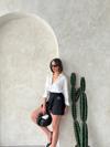 Sateen Düğme Aksesuarlı Deri Şort - Bej