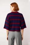 Ürün Özellikleri: Regular kalıp, akrilik materyal, çizgili desen, polo yaka, truvakar kol, triko kumaş, bordo renk, basic siluet.